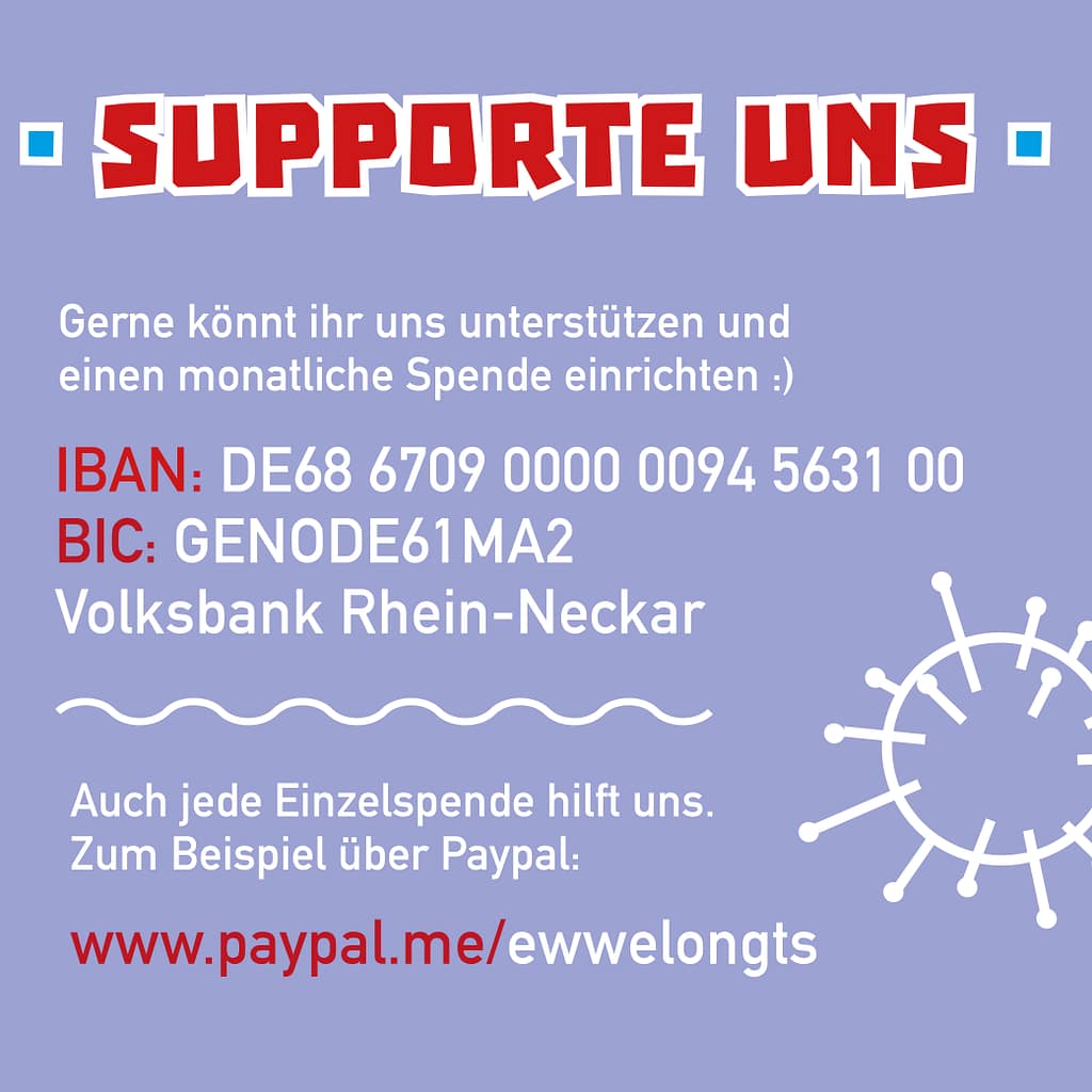 Da wir den Laden aktuell leider geschlossen haben müssen, sind wir aktuell vermehrt auf Spenden angewiesen. Daher freuen wir uns wenn ihr uns ein paar Euro sendet oder sogar einen monatlichen Dauerauftrag einrichtet.
