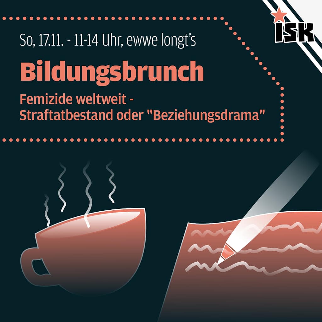 Außerdem stehen wir aktuell in der finalen Planung unserer Kampagne gegen Femizide. Wie wollen wir den Tag gegen Gewalt an Frauen (25.11.) gestalten und besonders in den Wochen davor und danach politische Ambitionen in die Praxis umsetzen? Wie können wir über Gewalt-/ und Machtverhältnisse in unserer patriarchalen Gesellschaft aufklären?