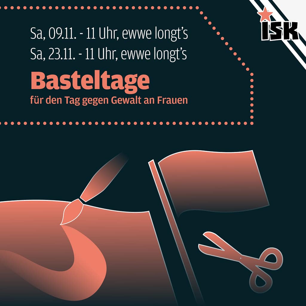 Um auf der Straße zu glänzen und unsere Kundgebung am 25.11. ordentlich zu bespielen, veranstalten wir 2 Basteltage. Wir werden zusammen Transparente malen, Schilder basteln und uns weitere kreative Aktionen für den Tag überlegen. Kommt gerne vorbei und macht mit!
