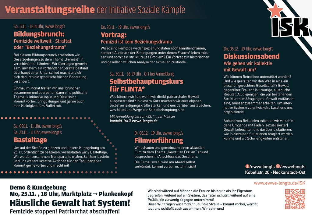 Außerdem stehen wir aktuell in der finalen Planung unserer Kampagne gegen Femizide. Wie wollen wir den Tag gegen Gewalt an Frauen (25.11.) gestalten und besonders in den Wochen davor und danach politische Ambitionen in die Praxis umsetzen? Wie können wir über Gewalt-/ und Machtverhältnisse in unserer patriarchalen Gesellschaft aufklären?